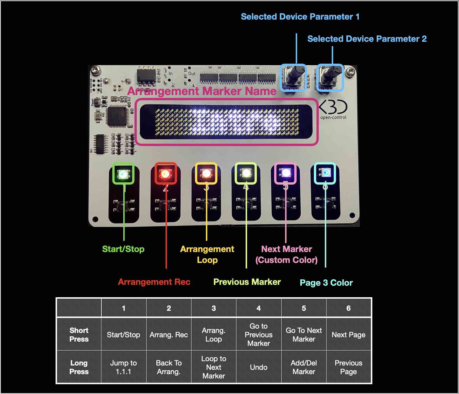Der Controller hat einen LED-Bildschirm, sechs Buttons mit „visual feedback“ und zwei Drehknöpfe. Die Buttons und Knobs können über die Web-App (auch offline) individuell eingerichtet werden. Dabei können neben globalen Funktionen (Metronom, Start/Stop, BPM +1/-1) auch die Arrangment- und Sessionview, einzelne Tracks oder Abletons Looper gesteuert werden. Eine vollständige Liste aller Aktionen findet ihr hier. Eines von vielen möglichen Mappings seht ihr in dem Bild.