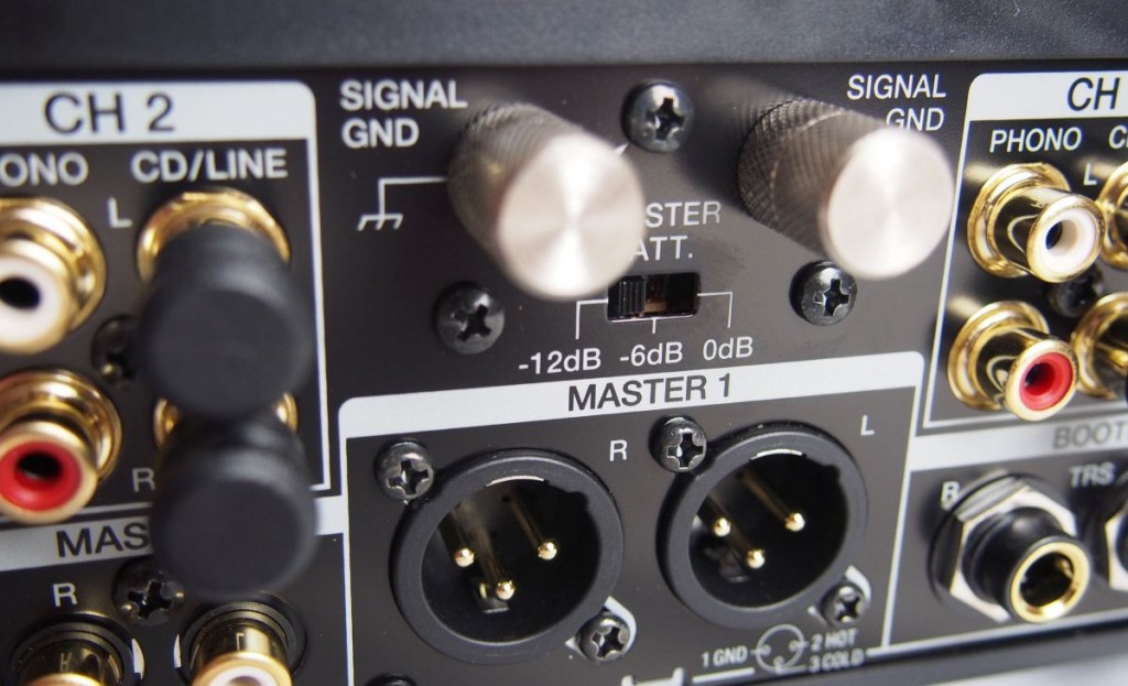 Auf der Rückseite sind alle Ein- und Ausgänge, mit Ausnahme des Kopfhöreranschlusses, untergebracht. Master liegt symmetrisch als XLR und unsymmetrisch als Cinch an. Der Masterpegel ist per Miniswitch um -6dB bzw. -12dB absenkbar. Der separat regelbare Boothausgang ist als 6,3mm Klinke ausgelegt, im Fall der Fälle also Adapter nicht vergessen. Die Eingänge für Plattenspieler und CD/Line sind jeweils doppelt vorhanden. Über Aux kann ein externes Gerät zugespielt werden. Das läßt sich per Cinch realisieren. Zudem ist der Mikrofoneingang als Kombibuchse ausgelegt. Hier passen entweder XLR- oder Klinkenstecker rein, im Level umschaltbar zwischen Mikrofon und Line. Zwei USB-Buchsen für die Verbindung zu den Rechnern, zwei erfreulich große Schrauben für die Erdung der Turntables und Buchse plus Schalter für die Stromzufuhr sind ebenfalls rückseitig untergebracht. Der Kophörerausgang befindet sich, als große und als kleine Klinkenbuchse, an der Frontseite des DJM-S9.