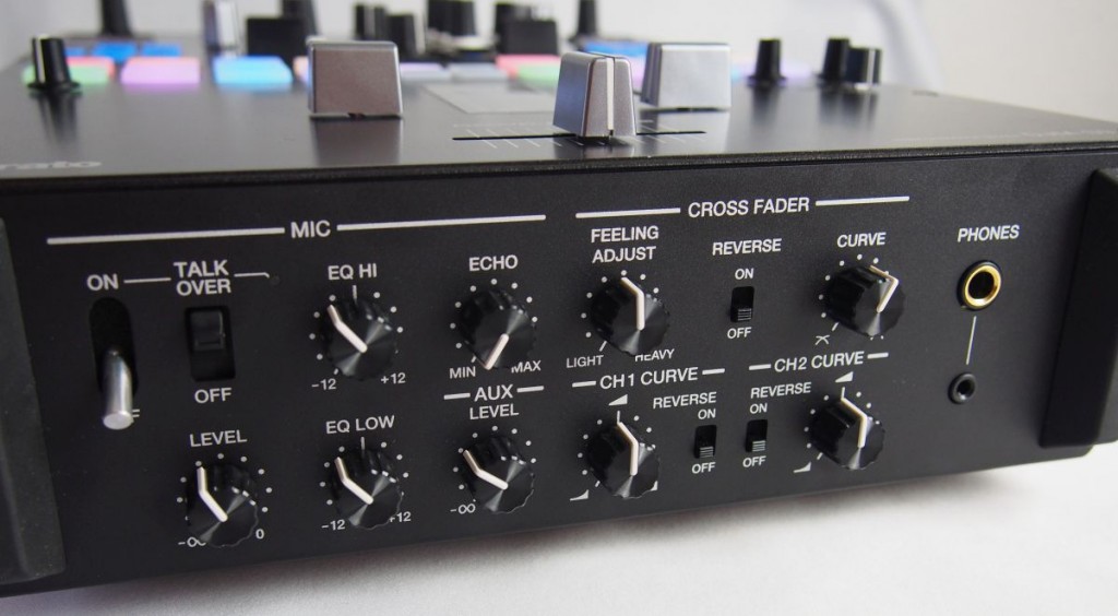 Eigentlich ein klassischer Zweikanaler. Typischerweise ist um die Fader viel Platz. Im Gegensatz zum Crossfader sind die Linefader nicht magnetisch ausgeführt. Aber sie sind (frontseitig) einzeln in Wirkungsrichtung (Reverse) und in der Faderkurve einstellbar. Die Levelkontrolle (Kanal und Master jeweils extra) hat neben LED-Segmenten eine zusätzliche Clipanzeige, die verzerrtes Mastersignal vermeldet.