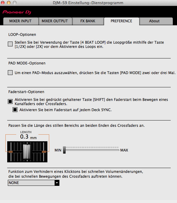 Zum Mixer und seiner Firmware installiert sich ein kleines Tool auf dem Rechner. Darüber lassen sich diverse Einstellungen vornehmen. Zuweisungen für In- und Output, die erwähnten Effekt- und Crossfadereinstellungen, aber auch die definierte Länge des (Auto). Und hier ist die "SYNC-Funktion" versteckt, die es an der Oberfläche nicht gibt. 🙂