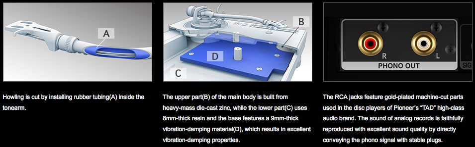 Der PLX-1000 ist ohne großen Zweifel an den Technics SL-1200MK2 angelehnt und soll dem entsprechend die Lücke zwischen CDJs und Mixern füllen, die bislang das Bild der Clublandschaft prägen. Die Ausstattung ist auf das Nötigste reduziert. Auch wenn es aussieht, als würde der PLX-1000 keine Besonderheiten besitzen, so scheint zu mindest der Tonarm einen inneren Gummimantel zu besitzen, der vor Vibrationen schützen soll.