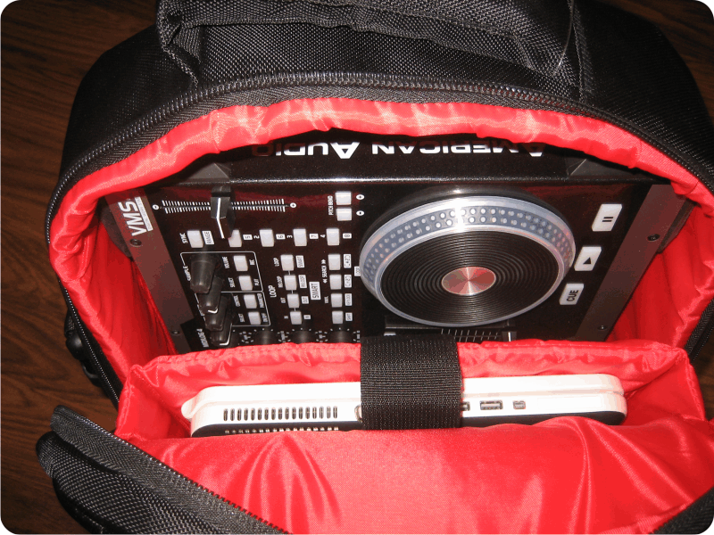 Ein großes Hauptfach mit eingearbeitetem und gepolstertem Laptophalter (laut Hersteller bis 19"), sowie Schutzmatte für den Controller, bietet Platz für Konsolen à là S4, MC-6000 & VMS4. Das vordere Fach ist mit einer herausnehmbaren Sortier"platte" (Accessories Panel) für Kabel, Interface, Stecker usw. bestückt und ganz vorne gibt es noch das obligatorische Geldbörsen- und Ausweisfach. Die Rucksackriemen können auch entkoppelt und in der dafür vorgesehenen rückseitigen Tasche versteckt werden, um den Backpack am Tragegriff oder Schulterriemen zu schleppen. Zu guter letzt gibt es dann noch die Magma-typische Trolley-Schlaufe, mit der sich der Backpack über das ausgefahrene Trolleygestänge ziehen und fixieren läßt.