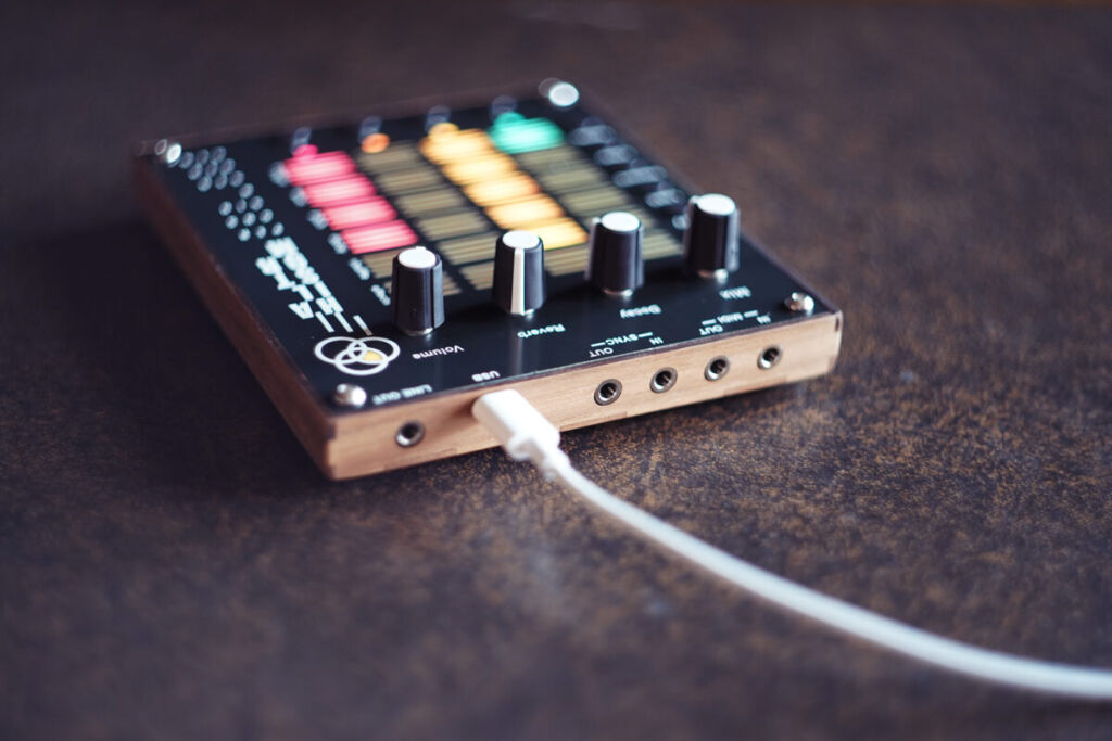 Bei den Anschlüssen finden wir MIDI In/Out und Sync In/Out als 3,5mm TRS, einen USB-C Anschluss der als Stromversorgung und MIDI dient und einen Stereoausgang.