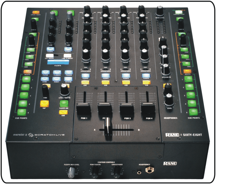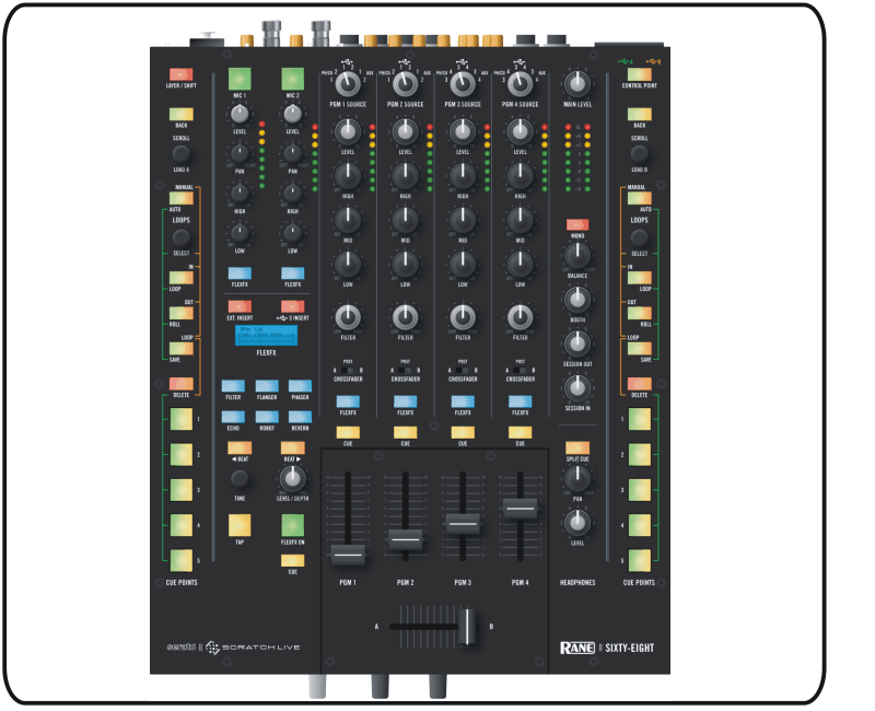Hier ist es also, das neue Mischpult mit 4 Kanälen aus dem Hause Rane. Wie zu erwarten war, sollen mit dem Sixty-Eight vor allem SSL-User angesprochen werden, da die beiden (!!) integrierten Scratchboxen per separate USB-Ports an 2 unterschiedliche Rechner angeschlossen werden können und das Verwenden einer SL1 bzw. SL3 somit (für beide DJs) entfällt.