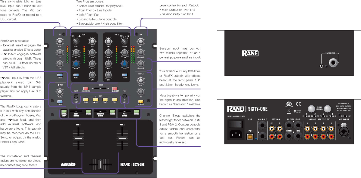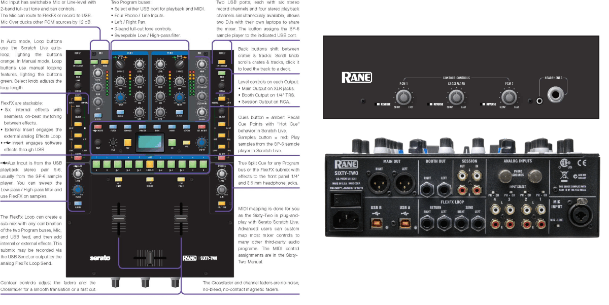 Die beiden neuen Modelle heißen "Sixty-One" und "Sixty-Two" und sind jeweils Zweikanal-Battlemixer mit eingebautem Audio-Interface oder besser gesagt einer SL-Box für Serato Scratch Live. Während der Sixty-One eine Art TTM-56 mit eingebauter SL2 Box ist, wirkt der Sixty-Two wie ein halber Sixty-Eight mit nicht nur massig Features an Board, sondern auch der Option, zwei Rechner parallel per USB anschliessen zu können. Somit lässt sich der DJ-Wechsel ohne großes Umsteckmanöver gestalten, zumindest wenn beide Scratch Live nutzen.