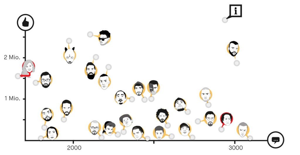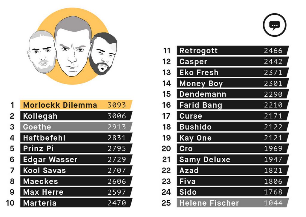 BR Plus hat mal nachgezählt, wer unter den deutschen Rappern die größte Wortvielfalt hat. Reine Statistik, die nichts zur Qualität oder über den kommerziellen Erfolg aussagt. Es wurden jeweils 16.000 Worte aus Texten des Künstlers genommen, anschließend wurden Doppelnennungen und Abwandlungen rausgestrichen. Unterm Strich blieben zwischen 1000 und 3000 Worte übrig. Letzte ist Helene Fischer, Dendemann, Money Boy oder Retrogott rangieren in der Mitte, in der Spitze zwängen - siehe da! - Kollegah und Hafti olle Goethe ein. Platz 1 geht an Morlockk Dillemma, der mit etwas über 3000 Worten die meisten Worte nutzt (oder braucht).