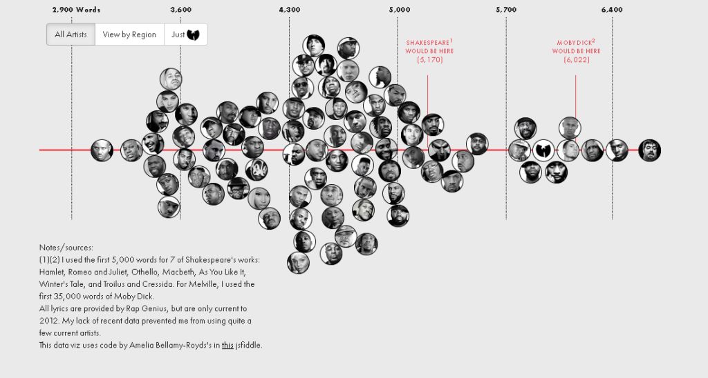 Im Original kommt die Idee der Wortskala von Polygraph. Matt Daniels hat US/UK-Rapper mit Shakespeare und Dickens ins Verhältnis gesetzt. Grundlage waren jeweils 35.000 Worte aus deren Werk. Mit 3214 Worten ordnet sich DMX ganz links auf der Skala ein, Shakespeare bringt es mit 5170 Worten ins gehobene Mittelfeld. Umringt wird er von MF Doom, Nas oder Redman. Ganz vorn liegen die Herren vom Wu-Tang Clan, die Krone geht an Aesop Rock. 7392 aus 35000 ... Tusch. Zur Feier wühle ich ein älteres Projekt hervor, welches Aesop Rocks Lyrics mit der Musik der Trip Hop Legende Portishead kreuzt.