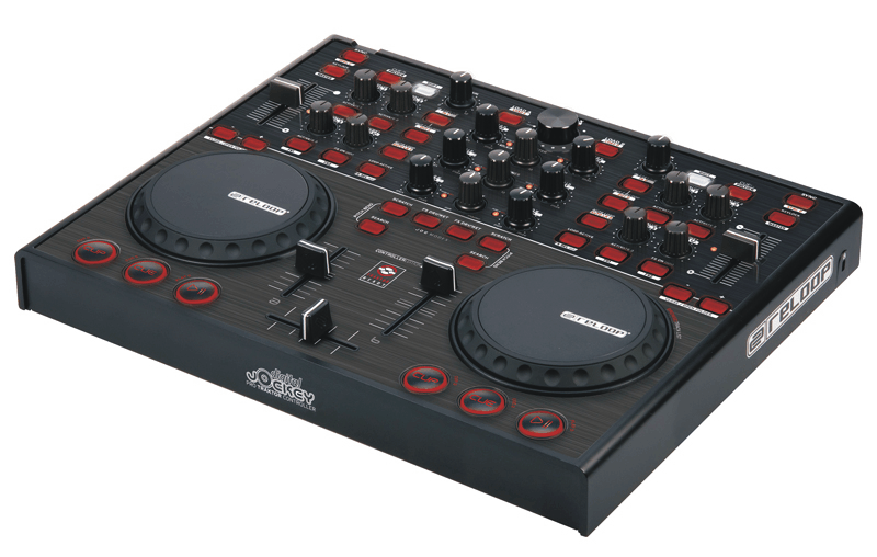 Kurz nachdem Version 2 des Digital Jockey in den Handel kam bestellte ich die Interface Edition des Controllers. Neben der eingebauten Soundkarte waren für meine Wahl vor allem die berührungsempfindlichen Jogwheels ausschlaggebend, die man ja so in der Preisklasse nur selten bzw. nie findet. Als das langersehnte Paket dann ankam, war ich doch überrascht wie groß es ausfiel. Der Digital Jockey wird in einer schwarzen Verpackung ausgeliefert, die unter anderem die Software Traktor LE, Treiber (Mac/PC), eine Anleitung, 2 Cinch-Kabel, ein Netzteil und den Digital Jockey selbst enthält.