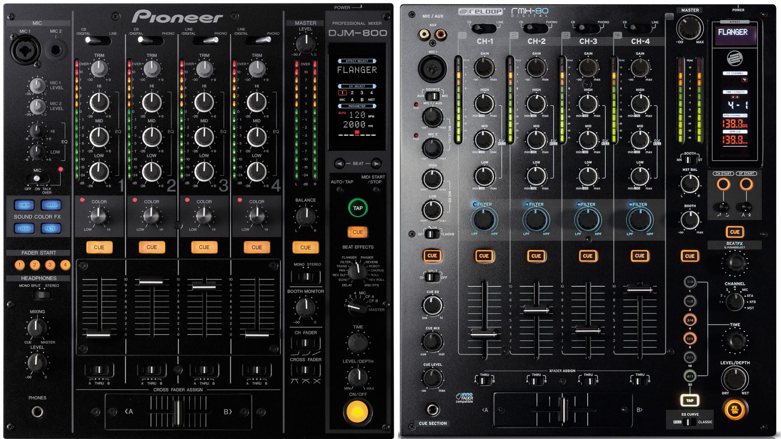 Der Reloop RMX-80 kommt in einem schwarzen Metallgehäuse daher und macht einen äußerst soliden Eindruck. Alle Drehregler sind äußerst griffig, da sie mit Gummi überzogen sind. Auch der Widerstand der Fader scheint auf die Bedürfnisse von Club-DJs abgestimmt zu sein. Addiert man diese Punkte zusammen und schaut sich dann noch die Farbgebung der Beleuchtung und das Layout an, könnte man fast meinen, dass man das schon mal irgendwo gesehen bzw. sogar angefasst hat.