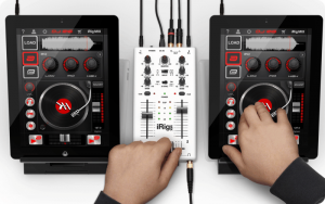 Szenario 2: ein iPAD mit kompatibler App (DJ RIG FREE im Lieferumfang) an einem Kabel am iRig MIX. Nach aktivieren des entsprechenden Input Modes kann man beide Decks der App miteinander verquirlen. Mikrofon und Monitoring sind wie bei Szenario 1, die Eingangs- und folglich die Ausgangssignale sind jedoch nur "Dual Mono". Wichtig ist, dass die App ein Signalsplitting unterstützt!