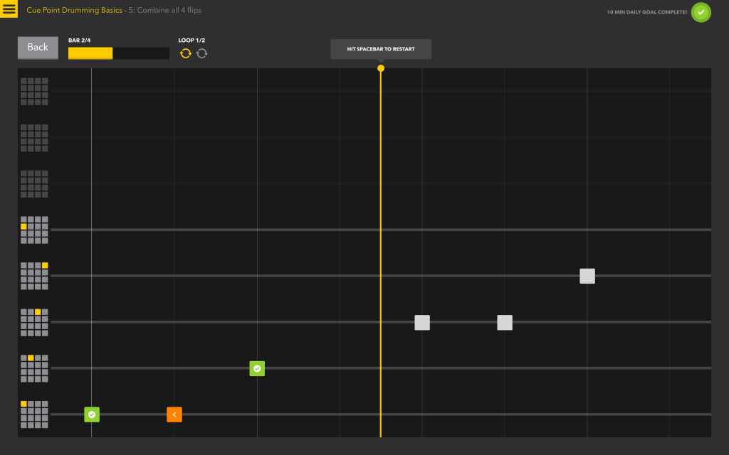 Ein System, welches an Notenlinien erinnert, zeigt die zu spielenden Elemente an und wo am Controller man diese findet. Also zum Beispiel Bassdrum, Snare oder Hi Hat. Wird die Übung gestartet, laufen "die Noten" über eine Markierung, das Zeichen diese anzutriggern. Wenige Loops Loops lang, ist die Übung so aufgebaut, dass in einzelnen Durchgängen Element für Element dazukommt. Man übt erst mit der Bassdrum, dann mit der Snare, dann in Kombination und am Ende den kompletten Beat.