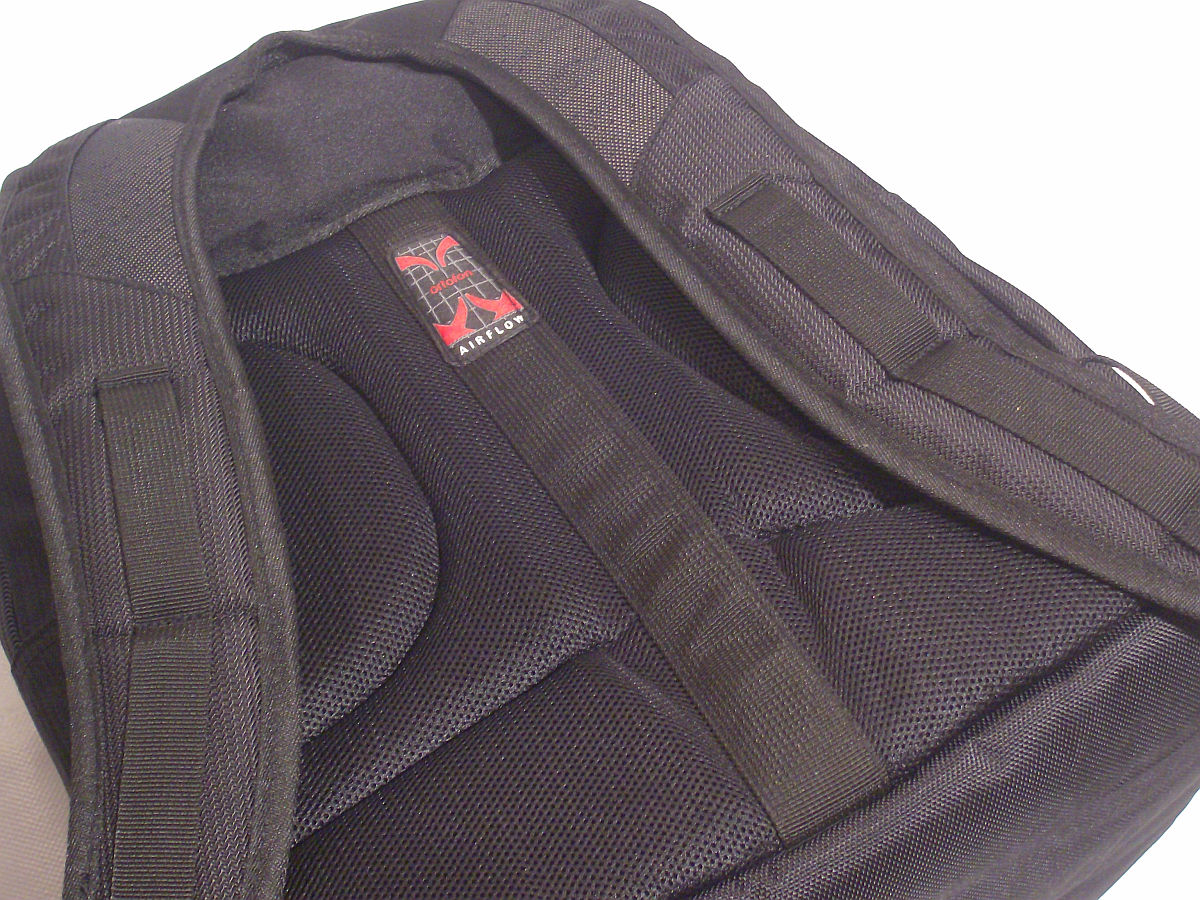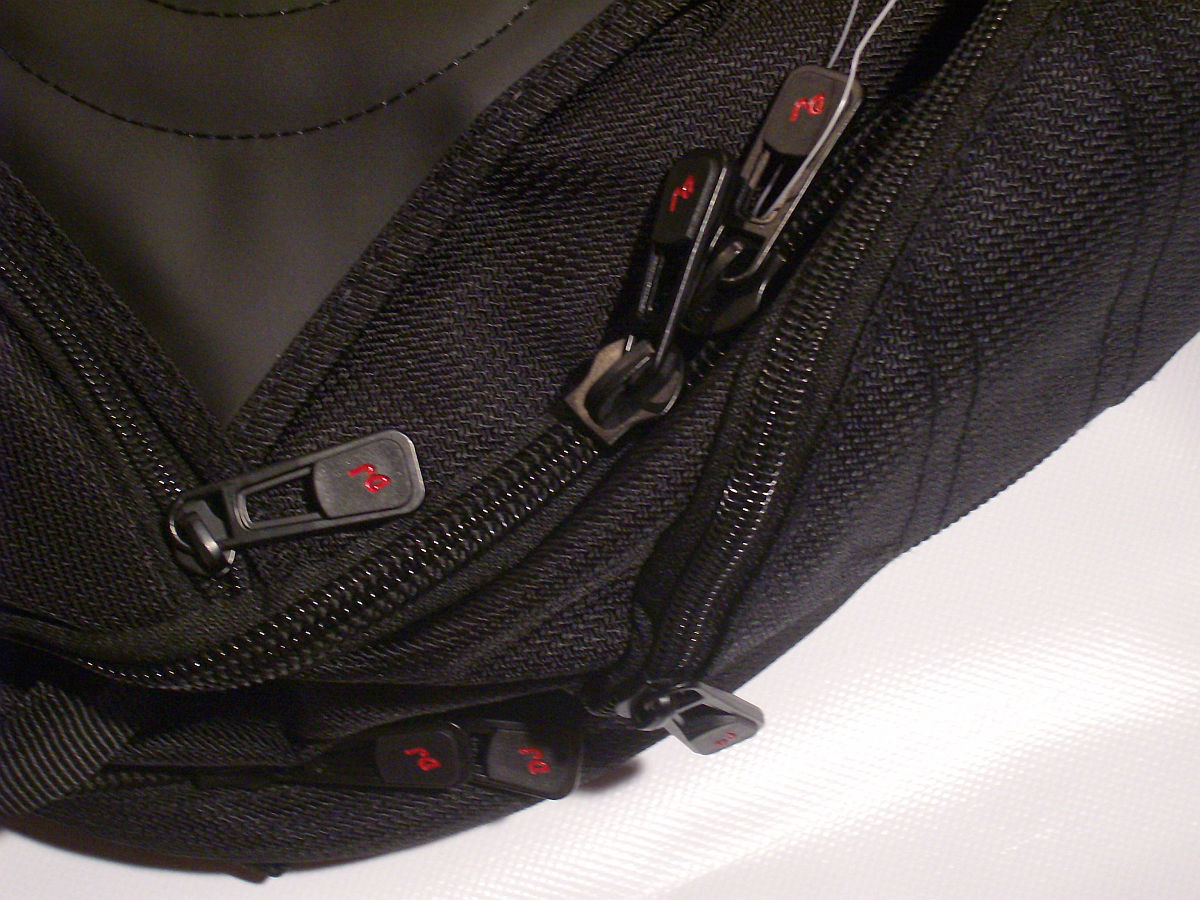 Eindruck außen-> Der "Bag" ist eigentlich ein "Backpack", also ein Rucksack. Von außen erinnert er mehr an einen modernen Daypack mit gepolsterter Rückenfläche, inklusive Airflow-Durchlüftung. Die Tragegurte sind verstellbar und ebenfalls gepolstert. Gefertigt ist der DJ GEAR BAG aus einem strapazierfähigem Material, welches ich für Balistic Nylon halten würde. Details lassen sich nicht in Erfahrung bringen, aber es fühlt sich so an. Eingearbeitet wurden aber auch Parts aus Kunstleder. Kreisförmig abgesteppt ist das vermutlich eine Reminiszenz an die Schallplatte, ich hatte aber auch kurz eine Assoziation zum Brustpanzer der Ninja Turtles. Ein Panzer schützt, das kann an einem Rucksack durchaus vorteilhaft sein. Auffällig sind drei Dinge: viele Reißverschluss-Zipper, ein gummierter Tragegriff und das markante ORTOFON-Logo.