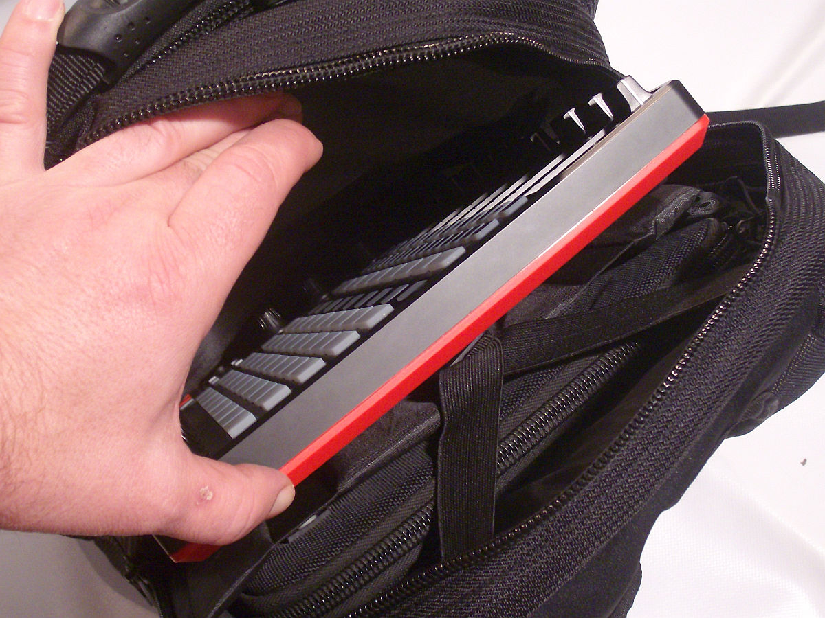 Überraschenderweise schluckt der Herausforderer alles Utensil. Ich bin verblüfft, hätte ich so nicht erwartet. Das mag daran liegen, dass der UDG durch seine verstärkte "Tornisterform" imposanter wirkt. Auch ein zweites Setup, bestehend aus einem XONE-23 (2-Kanalmixer) und zwanzig 12"-Vinyl fasst der ORTOFON-Bag mühelos. Als drittes verstaue ich meinen Rechner, die APC40 MK2 (Review dazu) und Zubehör. Die APC passt mit ihren 42cm x 25cm nahezu maßgeschneidert. In der Breite geht noch etwas, in der Höhe nicht mehr. Die Kapazität stimmt, der Tragekomfort ist gegeben, die Verarbeitung wirkt ordentlich.