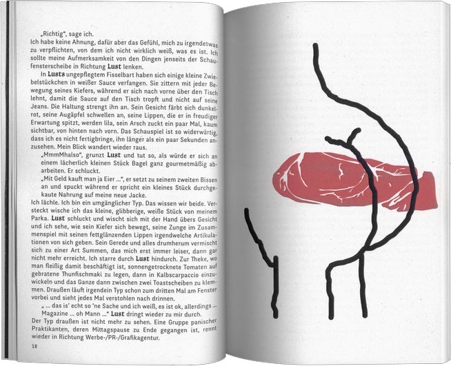 In einer Bar bemerkt die Figur eine Gruppe junger Heranwachsender. Alle Beteiligten haben wohl “von irgendetwas zu viel” konsumiert und die Ralph-Lauren-Chino-Combis triggern immens. “Ich glaube, ich bin depressiv”, schätzt der Protagonist ins Dunkle hinein. Kollege Lust hört zwar zu, aber überhört die Botschaft gänzlich. Getroffen von der Erkenntnis scheint der Protagonist sich immer weiter sozial zu isolieren. Nur Lust sucht in der Folge noch den Kontakt. So ringt das Ich am Telefon um Ausreden nicht aufstehen zu müssen, es gelingt jedoch selten. Wenig später ist in Lusts Büro Chaos ausgebrochen. Auf Drängen Lusts soll der Protagonist möglichst schnell erscheinen. Lusts Kiefermühle mahlt, die Einrichtung liegt zerteilt auf dem Boden. Lust scheint eine Panikattacke zu bekommen. Noch an der Tür verpasst Lust seinem Freund einen Schlag an den Kopf. Er beginnt zu bluten und läuft nach Hause.