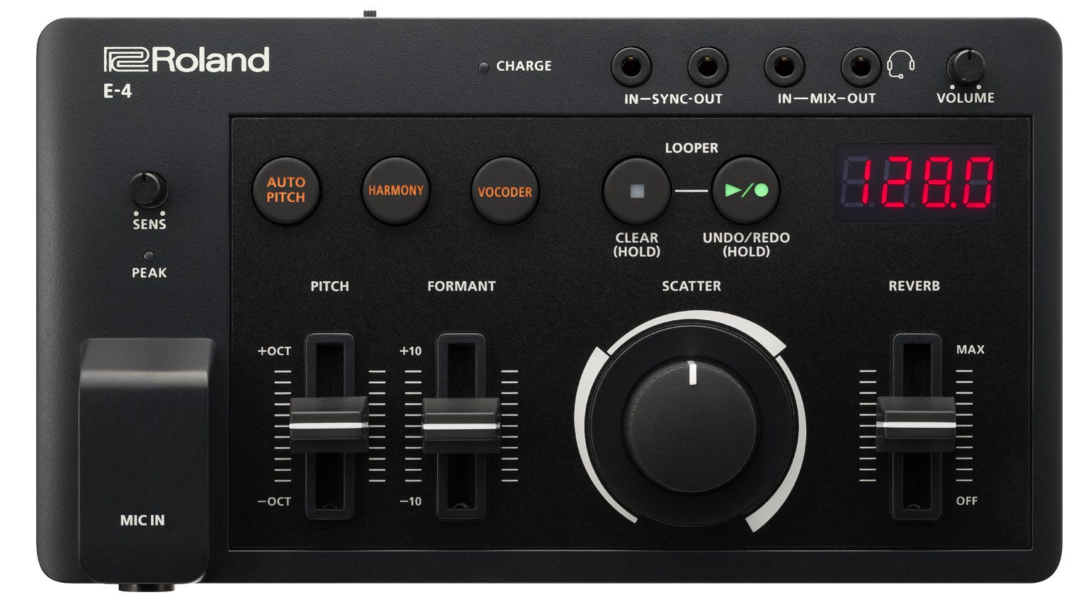 Vocoder, Harmonizer, Auto-Pitch, Glitcheffekte und Looper in einem Gerät. Der E-4 ist ähnlich aufgebaut wie die anderen beiden, besitzt allerdings noch einen eigenen, großen Klinkeneingang auf der Oberfläche um ein Mikrofon anzuschließen. Der Looper hat eine Aufnahmezeit von 24 Sekunden und es gibt einen eigenen Regler für Reverb. Speicherplatz für Loops gibt es leider nicht. Ansonsten setzt der E-4 auf ein minimalistisches Design, wobei der Vocoder auch über den MIDI-Anschluss per Keyboard gespielt werden kann.