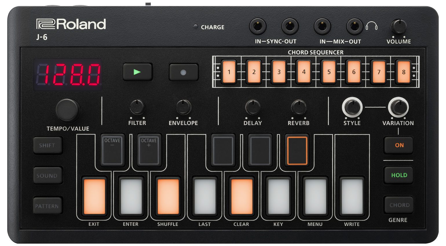 Weiter gehts mit dem Synthesizer J-6. Von den Anschlüssen und der Akkulaufzeit ist dieser komplett identisch mit dem T-8. Der vierstimmige Synthie basiert auf der Roland Juno-60 Synth Engine und kommt mit einem große Sequencer und Akkord-Sequencer. 100 Chords beinhaltet der J-8 und dazu kommen 64 Presets. Wie beim T-8 gibt es die internen Effekte Delay und Reverb, zusätzlich aber noch einen Filter Cutoff und einen Regler für die Hüllkurvenstärke. Beim J-6 macht der Aufbau den Eindruck, als würden mehr Parameter im Gerät selbst bearbeitet werden, statt über gesonderte Regler. Das kann am Ende etwas fummelig sein, in ersten Videos sah der Synthesizer aber nach einer Menge Spaß aus, mit dem man schnell Sequenzen erstellen kann.