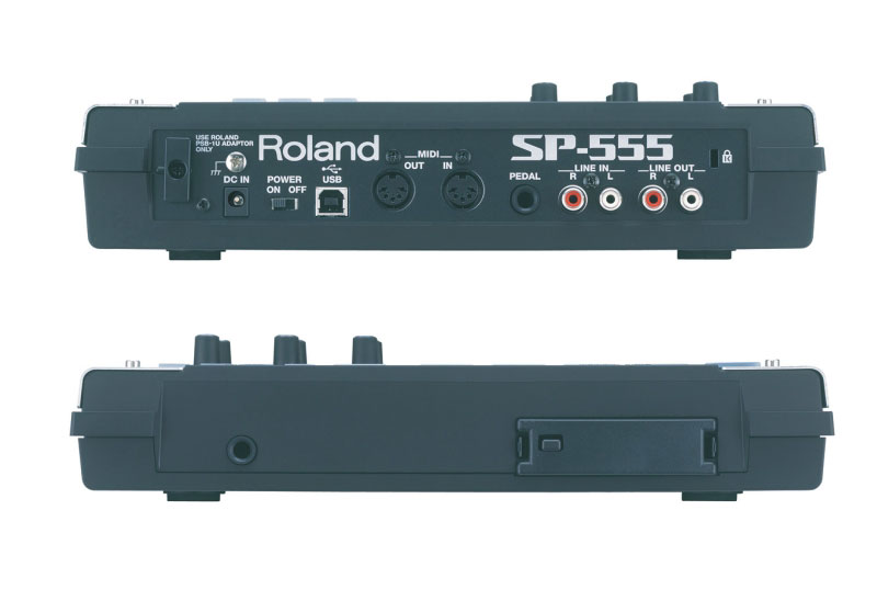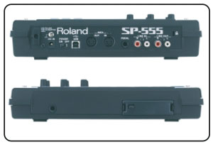 An Eingängen steht ein kombinierter Mikrofon/Hi-Z (Instrumenten) Eingang mit Phantomspeisung und ein Cinch Line-In bereit. Ausgangsseitig bringt der SP-555 einen Chinch Line-Out , sowie einen Kopfhöreranschluss mit, selbst MIDI I/O und ein Pedal Anschluss fehlen nicht.