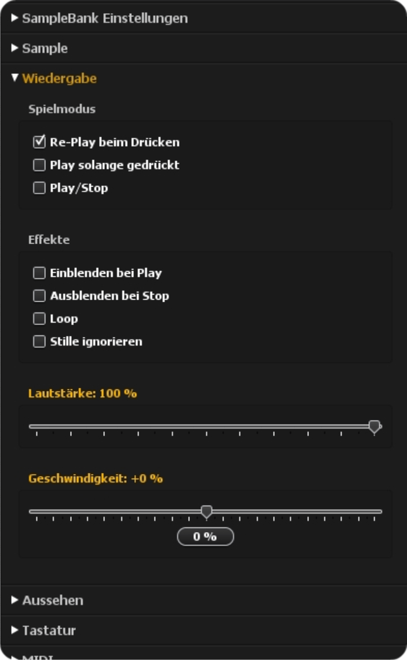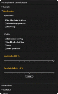 Die Wiedergabe läßt sich ebenfalls für jeden einzelnen Slot individuell anpassen. Dafür stehen 3 Spielmodi zur Wahl: "Re-Play beim Drücken" (Sample spielt und fängt bei erneutem Drücken wieder von vorne an), "Play solange gedrückt" und "Play/Stop" (Sample spielt, stoppt bei erneutem Drücken und wird zurückgesetzt). Es kann auch bestimmt werden, ob die Sounds im Loop laufen sollen und ob ein- bzw. ausgeblendet (Fade in / out) werden soll. Falls Samples zu Beginn einen stillen Part haben, kann dieser mit der Option "Stille ignorieren" übersprungen werden. Damit noch nicht genug, kann die Lautstärke nicht nur global, sondern auch separat für jeden Sampleslot angepasst werden. Wem ein Sample zu langsam oder schnell ist, der kann es über die Pitchfunktion +- 100% angleichen.