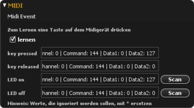 Bei Sample-Tools spielt die Steuerung immer eine wichtige Rolle. Dies ist in SampleDecks mitunter sehr gut gelöst, da man die Slots nicht nur einzeln per Mouse anklicken kann, sondern auch per Tastatur oder - am komfortabelsten - mit einem MIDI-Controller. Dafür steht eine praktikable MIDI-Learn Funktion zur Verfügung, mit der man Start- und ggf. Stop-Impuls sowie eine optionale LED-Ansteuerung schnell und einfach zuweisen kann. Sollte die LED-Zuweisung nicht auf Anhieb funktionieren, kann man über die "Scan"-Funktion alle LEDs aufblinken lassen und so das richtige Kommando automatisch suchen & finden lassen.