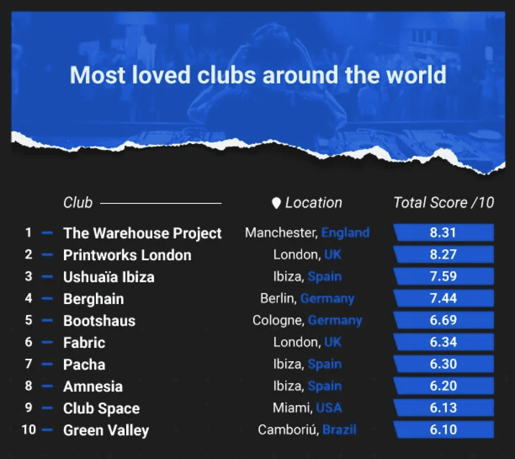 Für die Analyse hat das Team von DJ Tech Reviews zuerst einmal eine Liste der wichtigsten Clubs der Welt erstellt. Dafür wurden Clubs aus verschiedenen Rankings von DJ Top 100 Clubs, Hostelworld, Musicgateway und NME genommen. Von diesen Clubs wurde anschließend einige Social Media Kennzahlen ausgewertet. Dabei wurden Daten zu Instagram-Hashtags, TikTok-Hashtags, Social-Media-Followern, Google-Bewertungen und Suchanfragen als Bewertungsgrundlage herangezogen. Jeder Veranstaltungsort erhielt dann für jeden dieser Faktoren eine Punktzahl von eins bis zehn, bevor ein Durchschnitt aus diesen Werten gebildet wurde.