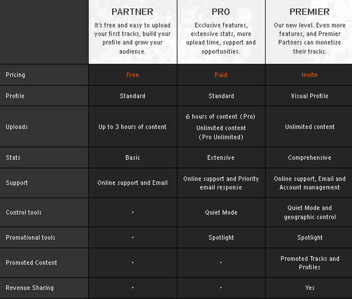 - Neu hinzu kommt der Account-Typ "Premier", mit dem Musiker ihr Werk monetarisieren können und über den Plattenfirmen Tracks und Profile promoten können . Diese Stufe erreicht man derzeit nur auf Einladung von SOUNDCLOUD.