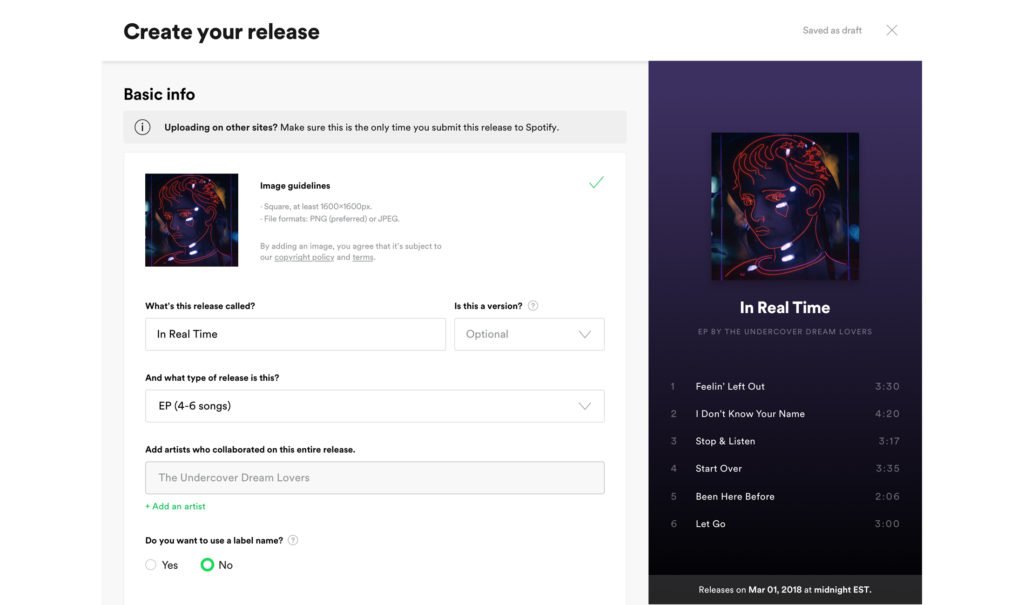 Spotify For Artists verspricht den Plattform-Usern das Uploaden so bequem wie möglich zu machen. Eine Vorschau und einfache Editier-Möglichkeiten sollen für Kontrolle darüber sorgen, wie die eigenen Tracks den zukünftigen Hörern präsentiert werden.