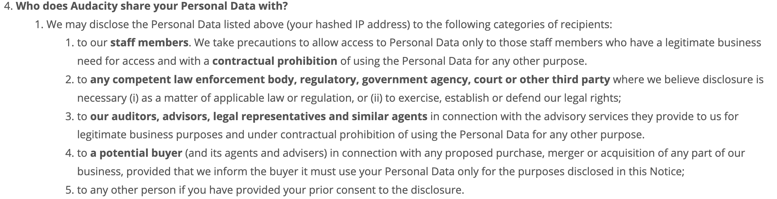 - Keiner der Daten wird an Behörden oder staatliche Stellen weitergegeben. Nur wenn ein Gericht einen entsprechenden Antrag stellt und Audacity dazu zwingt werden Daten weitergegeben.