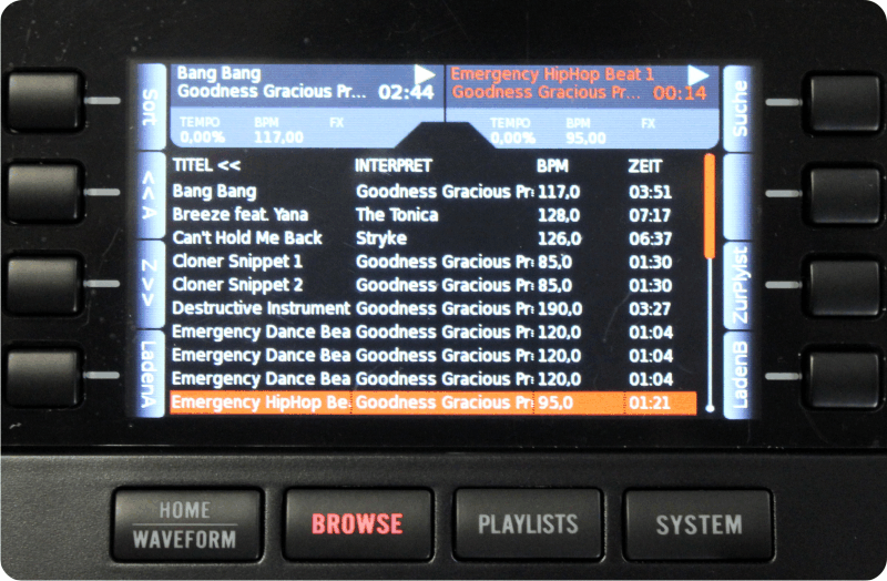 Mit 4,3 Zoll bzw. 11cm in der Diagonalen und mehrfarbiger Darstellung lassen sich die Infos im Prinzip ganz gut ablesen, aber teilweise erscheint die Auflösung etwas zu hoch gewählt, bzw. werden sehr viele Infos auf sehr kleinem Raum angezeigt, was gerade beim Browsen durch die Tracks und Playlisten eine relativ kleine Schriftgröße zur Folge hat. Teilweise ist man also geneigt, sich des öfteren Richtung Display zu beugen, um alles richtig ablesen zu können. Die farbige Waveform bildet das Frequenzspektrum eines Tracks ab (ähnlich wie bei Serato Scratch/Itch oder neuerdings auch Traktor 2), aktivierte bzw. inaktive Loops und deren Länge sind an einer blauen Hintergrundmarkierung zu erkennen. Sind in den Tags der Musikdateien die Coverbilder gespeichert, so werden diese im SCS.4DJ auch angezeigt. Sobald ein Track eine gewisse Restzeit unterschreitet (einstellbar in 5, 10, 20 oder 30 Sekunden), fängt die Titelinfo an rot zu blinken und die Gesamt-Wavedarstellung in der "Home"-Ansicht ändert sich ebenfalls von hellgrün (Deck A) bzw. hellblau (Deck B) zu rot. Für beide Decks lassen sich im Display auch noch der aktuelle Pitch- und BPM-Wert sowie der ausgewählte Effekt ablesen.