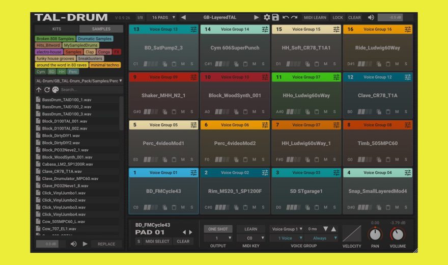 Mit TAL-DRUM könnt ihr ab sofort einen neuen Drum Sampler der Firma TAL für eure Beats und Grooves einbinden. Es lassen sich nicht nur Samples (wav, aif, flac, ogg, mp3 und mehr) per Drag-and-drop auf die maximal 32 Trigger Pads importieren, sondern auch via Record-Funktion aufnehmen. Diese Samples könnt ihr anschließend über mehrfache Ebenen der grafischen Benutzeroberfläche nachbearbeiten und nach euren Wünschen formen. Bis zu vier Samples lassen sich auf einem Pad zu einem Sound zusammenfügen (Layer). Das Audiorouting beinhaltet bis zu 16 Einzelausgänge. Das ist sehr wichtig für ein gutes Mixing.