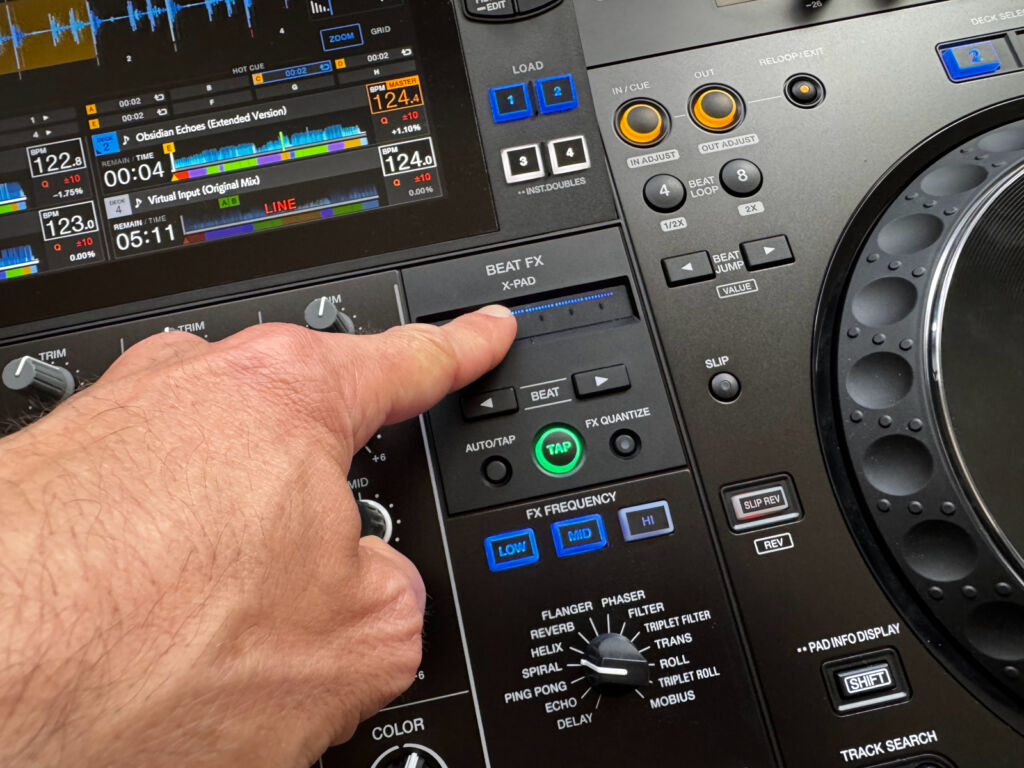 Nach dem Laden lassen sich die Songs bequem manuell oder mithilfe der Automatikfunktion beatmatchen. Dank der vielfältigen Einblendungen in den Jogwheel-Displays und auf dem Touchscreen behält man hier immer den Überblick. Dies funktioniert sowohl im Zwei- als auch im Vierdeckbetrieb, Abholfunktionen verhindern hier Parametersprünge. Schade ist allerdings, dass die Deckumschaltungen nicht farblich codiert sind und es keine großen Wellenform-Einblendungen für alle Decks im Vierdeckbetrieb gibt. Platz genug wäre ja auf dem Display und vielleicht ergänzt AlphaTheta diese Darstellung auch noch per Firmware-Update.
