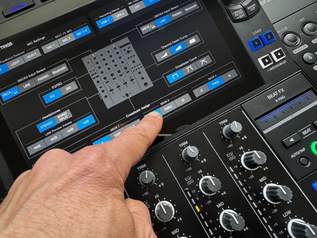 Das neue "Schlachtschiff" von AlphaTheta ist mit einem 10,1 Zoll großen Touchscreen ausgestattet. Das leicht angewinkelte Display reagiert verzögerungsfrei auf Eingaben, ist sehr gut ablesbar und ermöglicht die Steuerung zahlreicher Funktionen. Über das Display kann die Auswahl der Musikquelle, die Navigation in den Songsammlungen und die Konfiguration des Geräts erfolgen, zudem wird der Mixvorgang optisch unterstützt. Um den Bildschirm herum sind Taster und ein Drehregler platziert, die das Laden von Tracks beschleunigen.