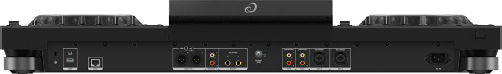 Über eine USB-C-Buchse kann ein Computer angeschlossen werden. Ein Ethernet-Link-Port erlaubt die Kommunikation mit kompatiblen Playern wie dem CDJ-3000 zur Steuerung der Decks 3 und 4. Alternativ können der Netzwerkanschluss oder die integrierte WLAN-Schnittstelle zum Zugriff auf Rekordbox genutzt werden, um Songs von einem Rechner abzuspielen. Bluetooth ist ebenfalls mit an Bord für drahtlose Zuspielungen von einem Smartphone oder Tablet.