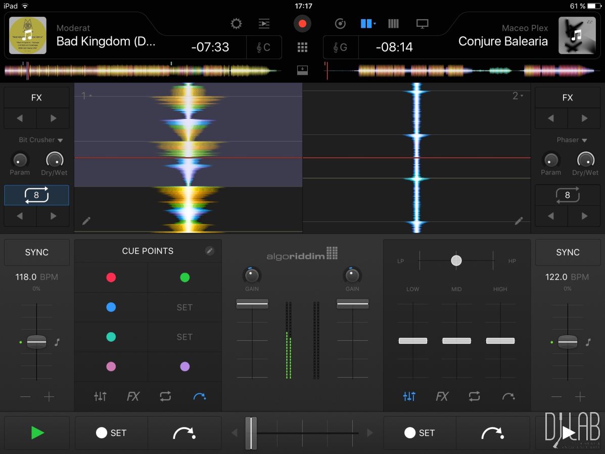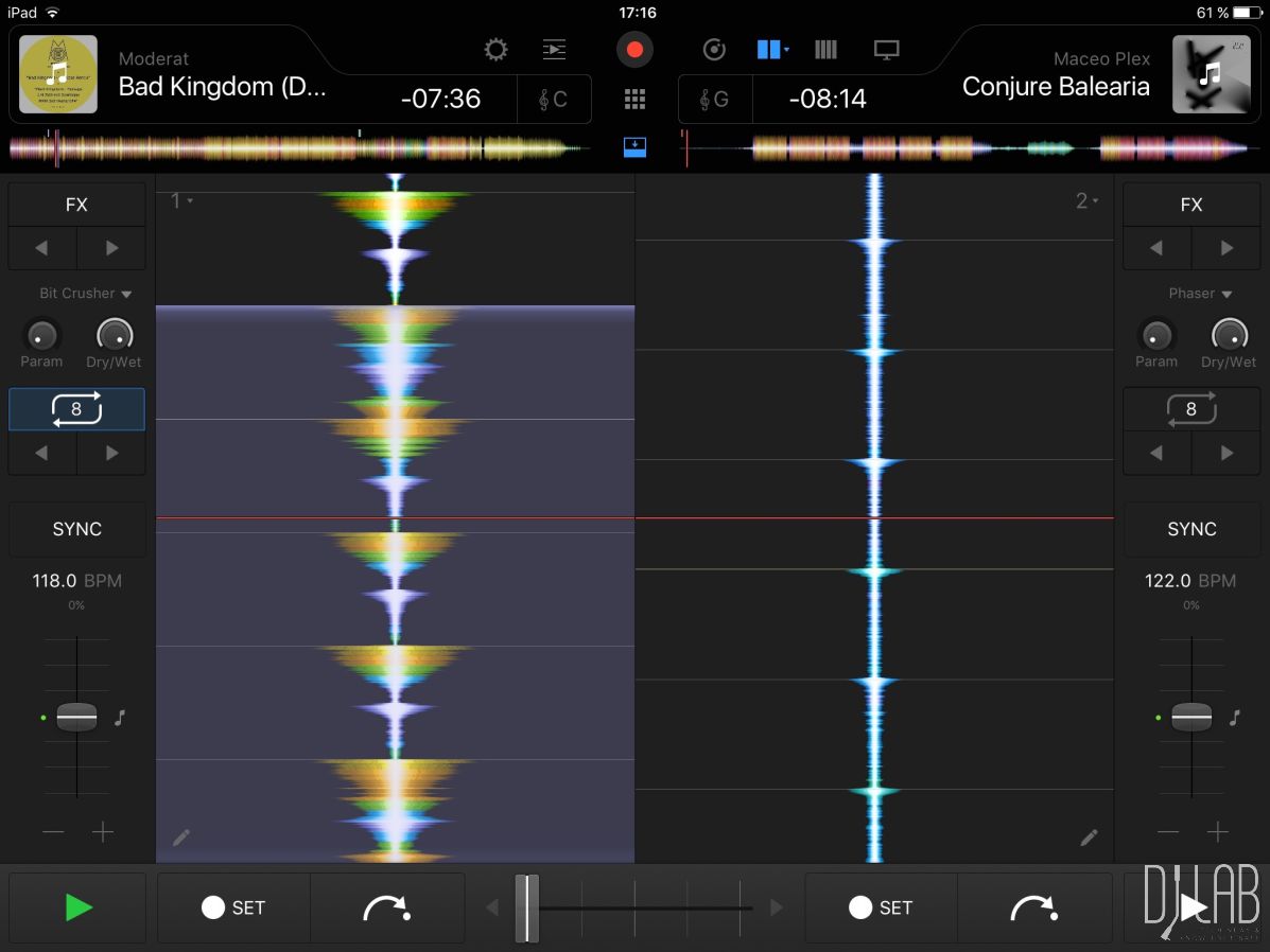 Für letzteres benötig ihr einen zahlungspflichtigen Premiumaccount, der aktuell 9,99 Euro pro Monat kostet. Wenn ihr die intern im iPad gespeicherten Songs nutzen möchtet, empfiehlt es sich, diese alle auf einmal in der Mediathek-Ansicht analysieren zu lassen, damit sie schneller zur Verfügung stehen. Neben dem Tempo wird hierbei auch die Tonart eines Songs ermittelt. In meinem Test war ich mit den Analyseergebnissen sehr zufrieden, da selbst die typischen Erkennungsfehler ausgeblieben sind, die oft bei Drum-n´- Bass- oder Dubstep-Tracks auftreten. Sollte das erkannte Tempo aber trotzdem einmal nicht stimmen, könnt ihr es manuell bearbeiten und das Beatgrid korrigieren. Die Tracks lassen sich nach der erfolgten Analyse aber nicht nur automatisch beatmatchen, sondern auch ihre Tonart kann angepasst werden. djay Pro verfügt über eine Performance-Ansicht, in der die Anzahl der virtuellen Bedienelemente auf das Wesentliche reduziert werden und die Wellenformen oder Plattenteller als Großdarstellung erscheinen.
