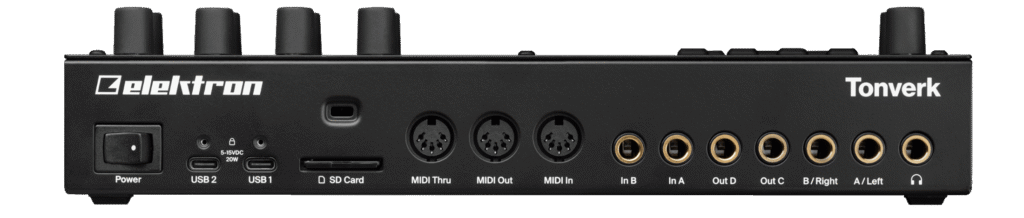 Abgerundet wird die Anschlusssektion vom Powerschalter und einem SD-Kartenslot, über den sich die internen 5 GB Speicher des Tonverk erweitern lassen. Im Lieferumfang ist sogar eine 64 GB SD-Karte enthalten. In der Verpackung des Tonverk befinden sich außerdem ein beidseitig bedrucktes Poster, ein Kärtchen mit Hinweis auf Software Updates sowie ein hochwertiges 1,50 m USB-C-Kabel mit Elektron Kabelbinder. Wie bei vielen anderen Elektron Geräten zuvor, ist auch Tonverk direkt nach Veröffentlichung (noch) nicht Overbridge-kompatibel.
