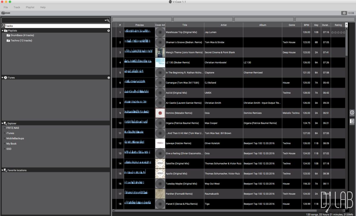 Da die im Player integrierte Songanalyse allerdings nicht besonders treffsicher ist, rate ich zum Einsatz der kostenlosen Vorbereitungs-Software V-Case. V-Case arbeitet ähnlich wie Rekordbox von Pioneer DJ oder Engine Prime von Denon DJ, ist aber leider etwas langsam, so dass ihr bei einem großen Datenbestand Zeit einplanen solltet. Das Programm analysiert Songs bei passend gewählten BPM-Bereichen recht zuverlässig und erlaubt das Anlegen von Playlisten.