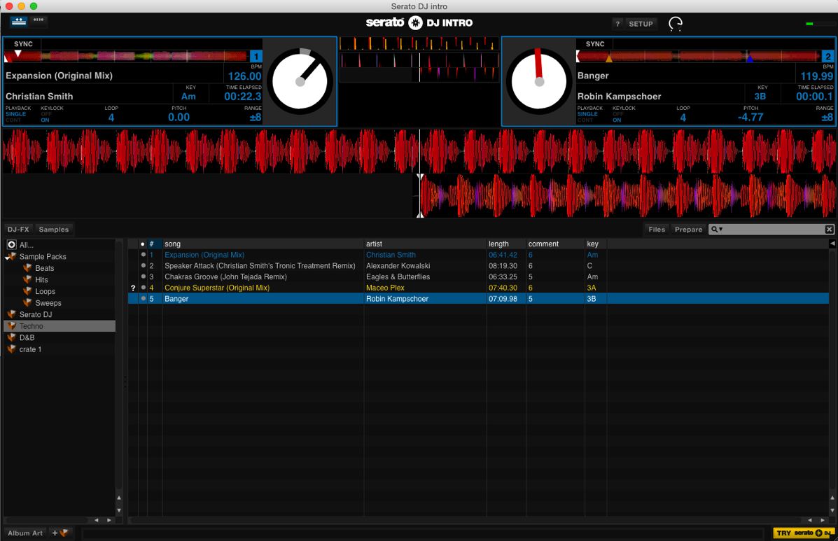 Songs lassen sich mit dem zentral platzierten Encoder selektieren mit den Load-Tasten in die Decks laden. Das Beatmatching könnt ihr der Software überlassen oder selbst handanlegen. Beides funktioniert ordentlich und zuverlässig. Wirklich überrascht haben mich die Jogwheels. Diese sind nicht nur groß, sondern erlauben auch eine gute Songsteuerung und das Ausführen von Scratch-Manövern – das ist keine Selbstverständlichkeit bei Geräten dieser Preisklasse.