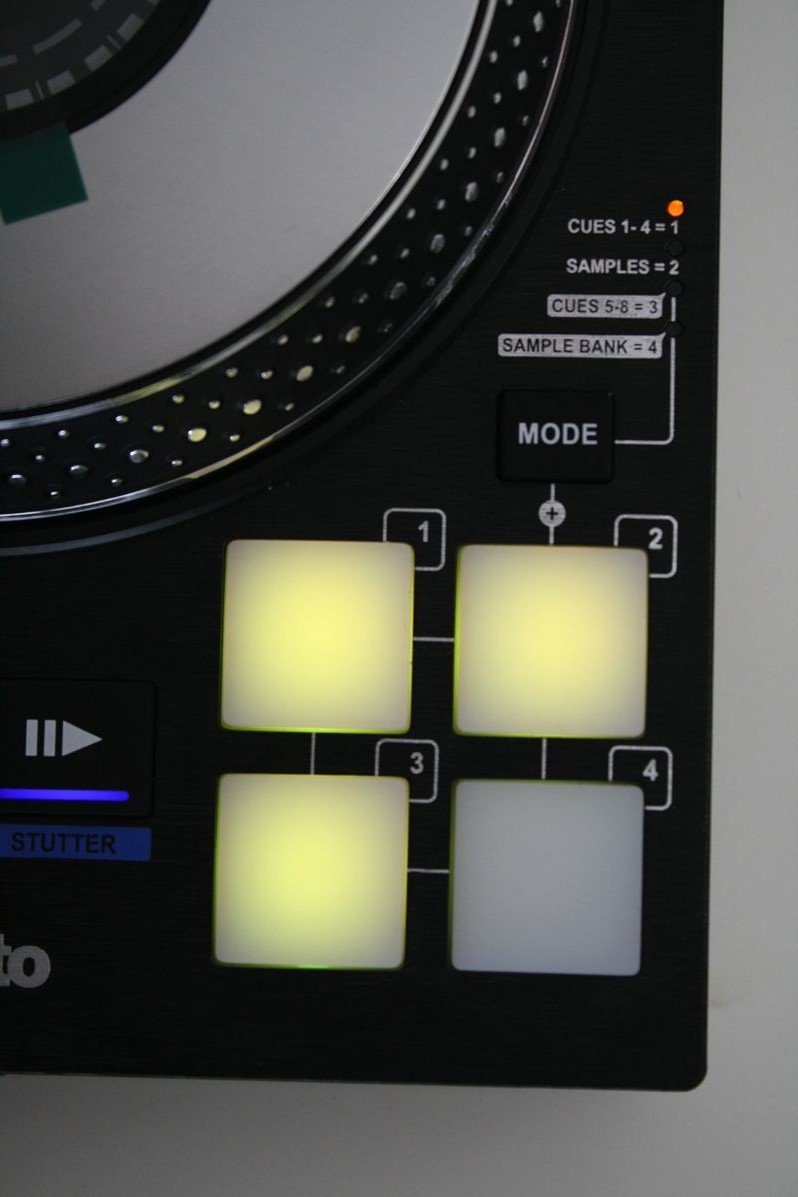 Die Crossfader-Kurve könnt ihr per Software stufenlos einstellen und einen Cut-In von 2 Millimetern für das Scratchen wählen. Zwei LED-Kreise innerhalb der Jogwheels lassen sich mit dem ControlPanel konfigurieren und für verschiedene Hilfestellungen nutzen. Sie zeigen zum Beispiel die Songposition und den Anfang des Scratch-Bereichs. Der Jogvision bietet zum Setzen und Anfahren von Cue-Punkten vier Pads. Durch einen Modus-Umschalter können diese zudem für Samples aber auch für vier weitere Cue-Punkte genutzt werden. Ich finde aufgrund der kompakten Bauweise, kann man diese Komforteinschränkung akzeptieren.