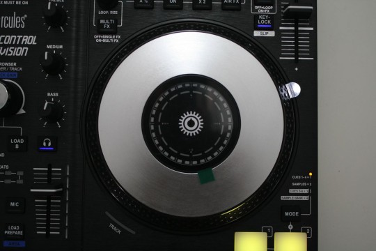 Oberhalb der groß dimensionierten Jogwheels, die mit je zwei LED-Kränzen ausgestattet sind, befinden sie sich die Loop- und Effektsteuerungen. Eine Taste mit der Aufschrift „AIR FX“ dient zur Aktivierung eines Controllers, der durch Abstandsänderungen gesteuert wird. Der Mixerbereich beherbergt zwei Kanäle mit Dreiband-EQs, Kanalfadern sowie einen Crossfader.