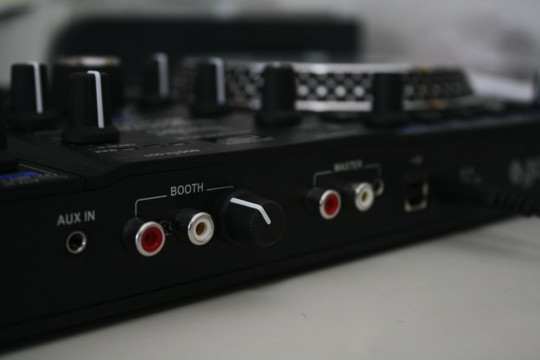Darüber hinaus gibt es in hier Tasten zum Umschalten der Darstellung der Software und zur Aktivierung der Scratchfunktion. Die im Controller integrierte Soundkarte lässt sich mit bis zu 24 Bit und 96 kHz betreiben und verfügt über zwei Stereoausgänge und zwei Stereoeingänge. Die Rückseite des Jogvision beherbergt den Masterausgang mit Cinch-Buchsen und einer Miniklinkenbuchse und den Boothausgang samt Pegelregler, der ebenfalls mit Cinch-Buchsen ausgestattet ist.