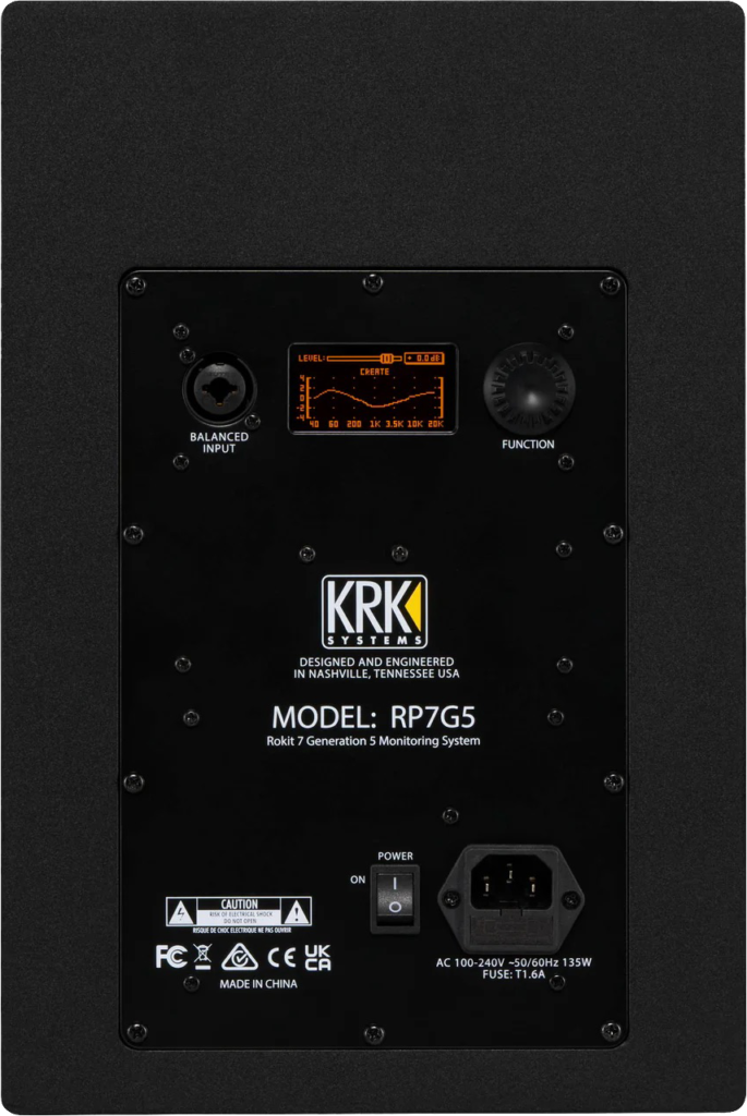 Optisch wird die Rückseite der KRK Rokit RP7 G5 immer noch vom Display beherrscht. Und natürlich ist das grundsätzlich ein interessantes Feature. Aber wozu wird mir eine EQ-Kurve auf einem Display dargestellt wird, das ich überhaupt nicht sehen kann?! Wer sich Lautsprecher dieser Preisklasse kauft, hat wahrscheinlich nicht genügend Platz in seinem (Bedroom-)Studio, um lässig hinter die Speaker zu spazieren.