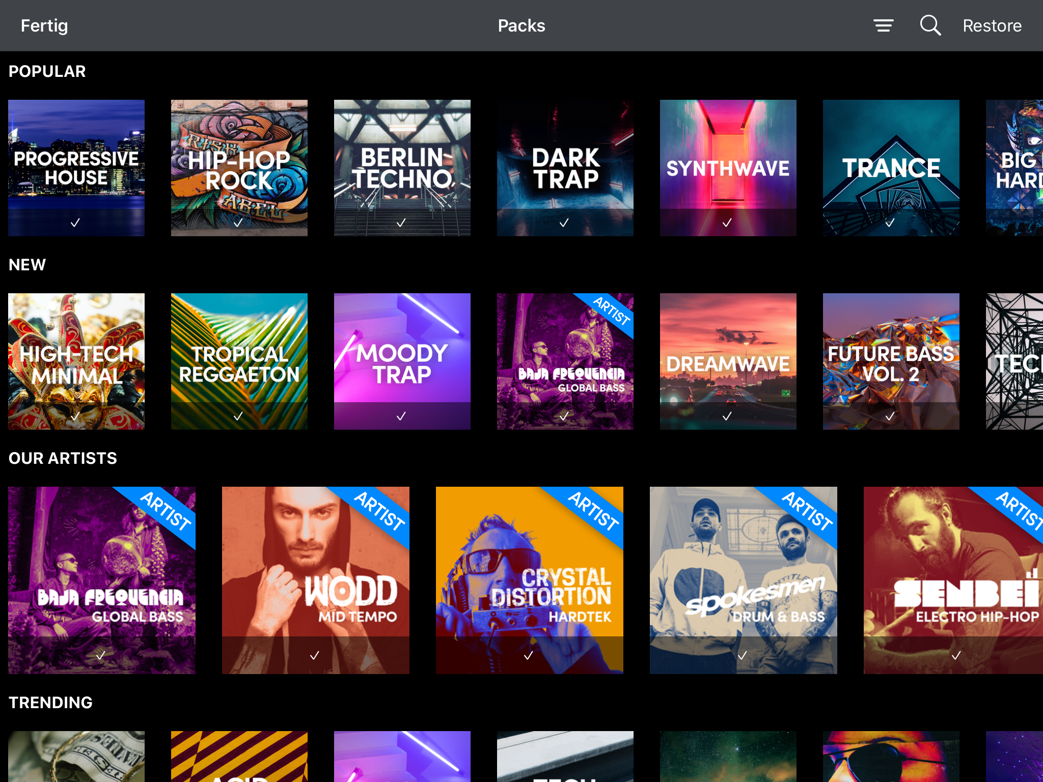 In der Loop-Matrix, die es bereits seit der ersten Version von Remixlive gibt, sind farblich codierte Samples mit unterschiedlichen Inhalten positioniert. Verwendet man eines der fertigen Packs, die sich per In-App-Kauf ergänzen lassen, so erhält man perfekt aufeinander abgestimmte Kickdrums, Snares, Hihats, Bässe, Chords, Leads, Vocals und FX, die sich beliebig miteinander kombinieren lassen und per Finger-Tap oder Streichbewegungen aktivierbar sind. Es gibt Packs verschiedener Stilrichtungen wie Progressive House, Dark Trap, Berlin Techno, Hip-Hop, Rock etc., von Künstlern wie Carl Cox, Rhino oder Boris Brejcha.
