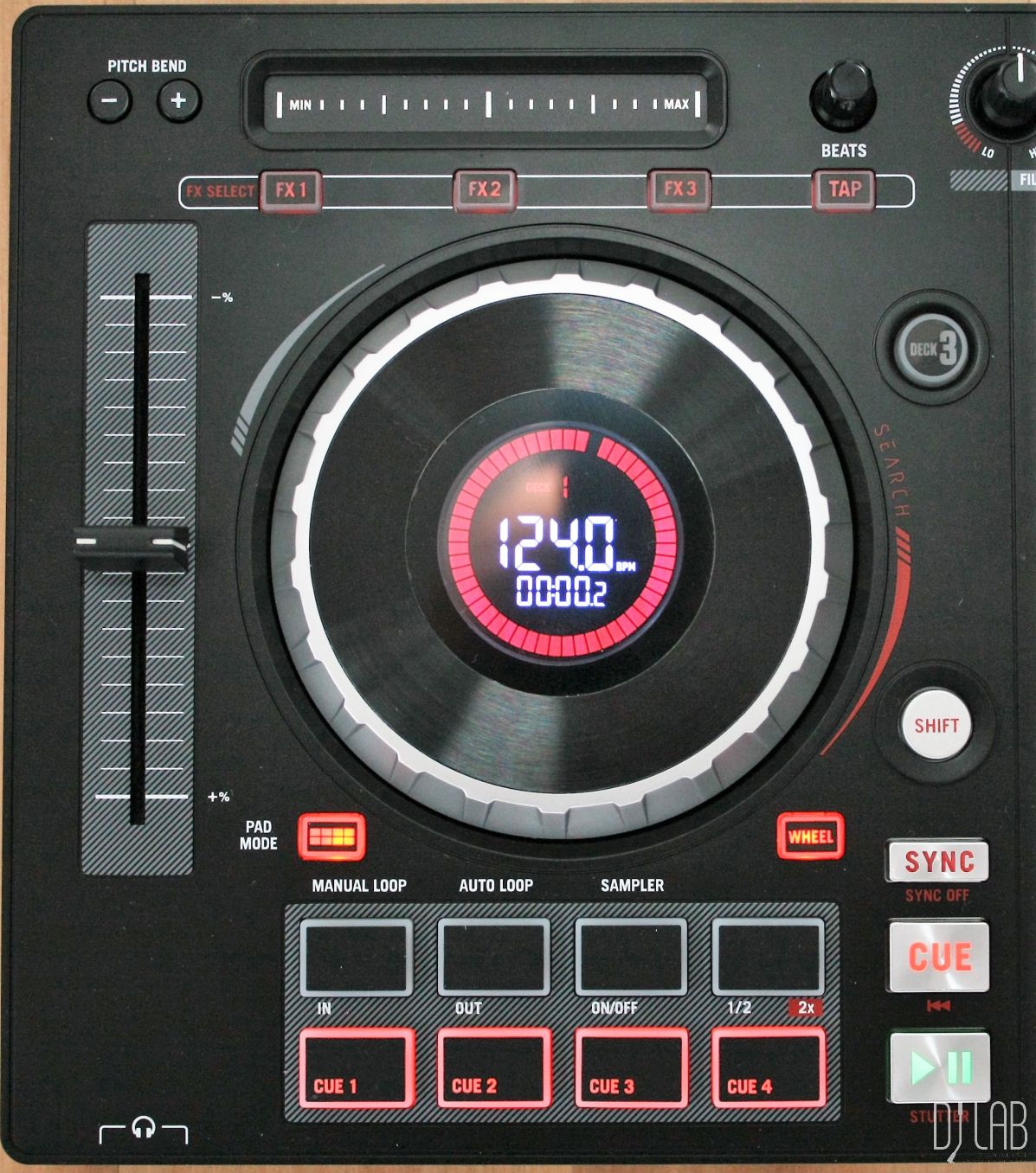Dieses gelingt durch eine Doppelbelegung der Bedienelemente in den Decks und in den Kanalzügen. Wichtig ist hierbei, dass ihr die Kanalfader im Auge behaltet, da beim Umschalten der Decksteuerung keine automatische Positionsanpassung erfolgt. Eine Abholfunktion sorgt aber dafür, dass es nicht zu Pegelsprüngen kommt. Die in den Jogwheels verbauten Displays zeigen mixrelevante Infos und auch das aktuelle gewählte Deck an. Mit den berührungsempfindlichen Wheels könnt ihr Tracks anschieben und abbremsen oder auch scratchen. Im Vergleich zum Mixtrack Pro 3 sind die Jogwheels allerdings wenig griffig und die Ausführung von exakten Scratch-Manövern fällt dadurch recht schwer. Hinzukommt, dass sich das Cut-Lag des Crossfaders nur bis auf circa 2 Millimeter reduzieren lässt. Bei aller Kritik solltet ihr aber im Hinterkopf behalten, dass es sich um ein Gerät für Einsteiger handelt, an das man sicherlich nicht die gleichen Ansprüche stellen sollte, wie an ein deutlich teureres Profigerät. Gleiches gilt für die Haptik und den Klang, die, wie ich finde, für ein Einsteigergerät vollkommen ausreichen sind.