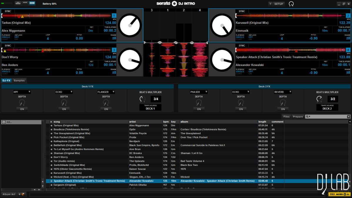 Numark hat dem Mixtrack Platinum eine Lizenz der Software Serato DJ Intro beigelegt, die ihr herunterladen und installieren müsst. Nach dem Starten der Software wird das Mapping für den Controller automatisch geladen und das System ist betriebsbereit. Erfreulicherweise muss nicht einmal unter Windows ein Treiber für den Controller installiert werden. Die Anordnung und Zuweisung der Bedienelemente ist schlüssig, so dass ihr nach kurzer Einarbeitungszeit mit dem ersten Mix starten könnt.