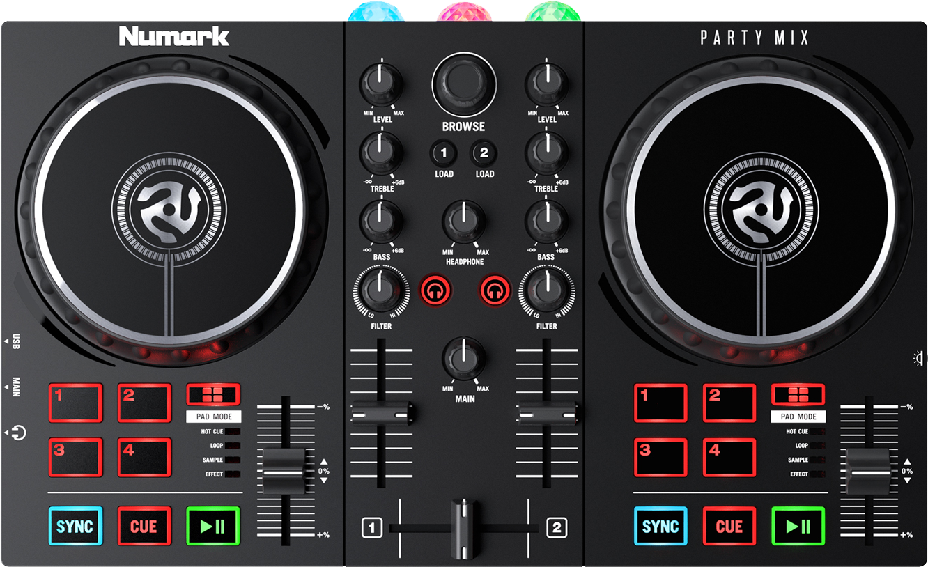 Die beiden Decks des Numark Party Mix II sind symmetrisch aufgebaut und beinhalten illuminierte und leicht erreichbare Start/Pause-, Cue- und Sync-Taster, die bei Betätigung eine akustische Rückmeldung geben. Jogwheels mit einem Durchmesser von circa 10,5 Zentimetern erlauben die Trackmanipulation und Pitchfader mit einem Regelweg von 4,5 Zentimeter dienen zur Tempojustierung. Im Bereich der kreativen Steuerungen gibt es pro Deck vier kleine Performance-Taster, die mit HotCue-, Loop-, Sample- und Effekt-Steuerungen belegt sind.