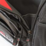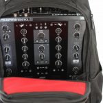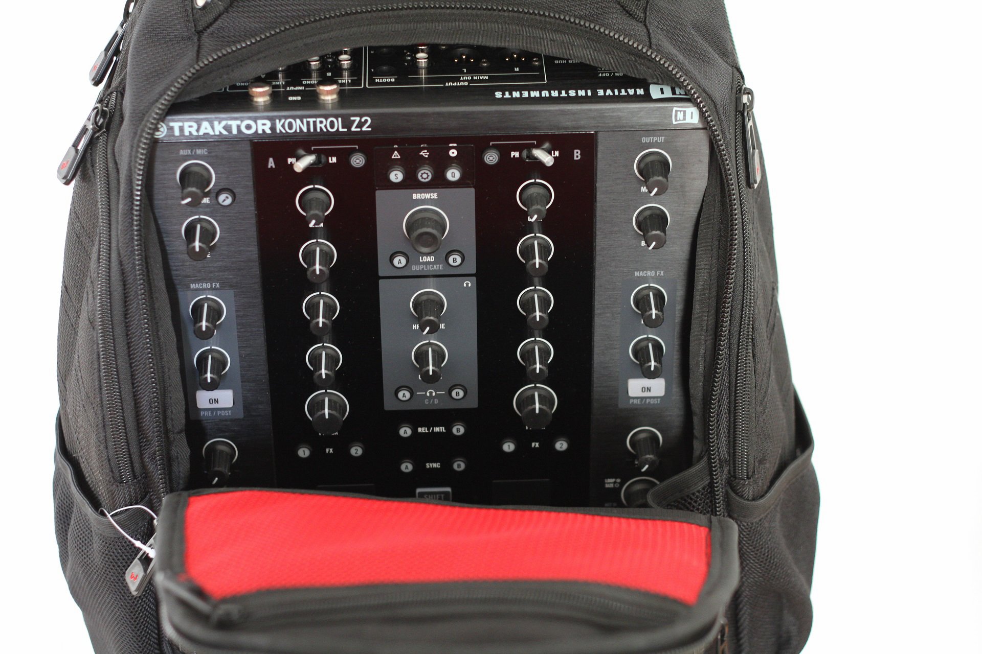 Die Fronttasche eignet sich besonders für kleineres Zubehör. Vor allem Nadelboxen passen hier ziemlich gut rein - wer hätte das gedacht? Im nächsten Fach bietet zusätzlich eine Netztasche beispielsweise deinen Kopfhörern sicheren Halt. Aber auch ein DVS-Interface passt hier problemlos rein. Die knallroten Netztaschen stellen insgesamt einen schönen optischen Kontrast zum dunklen Material des Rucksacks dar. Im hinteren Fach finden Vinyls und ein Laptop Platz. Durch die verstärkte Polsterung und eine Sicherheitsschnalle wird Dein Laptop gut vor Stößen geschützt. Das Herzstück der Tasche ist das Mixerfach. Es ist für Mischpulte bis 10" vorgesehen. Größere Geräte, wie ein Traktor Kontrol Z2, passen mit etwas gutem Willen auch hinein. An den Innenseiten befinden sich jeweils rechts und links noch weitere Netztaschen für Zubehör.