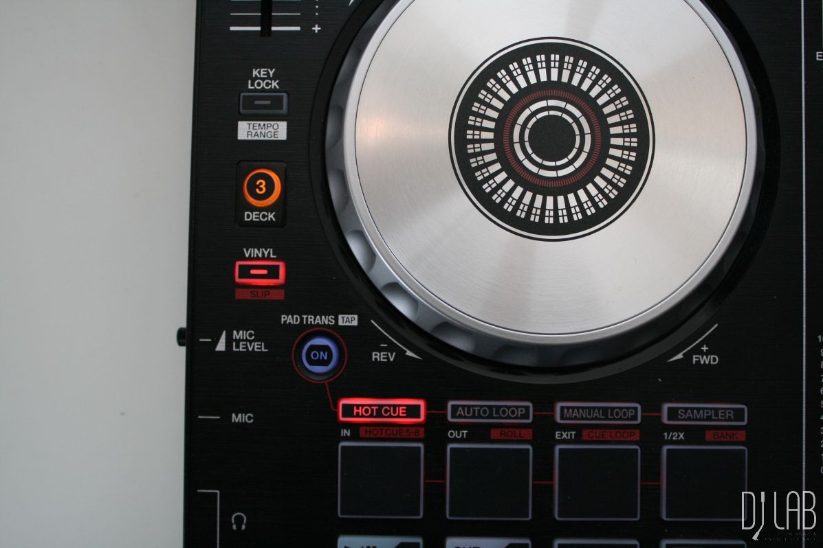 Oberhalb der Pads befinden sich silberfarbene Jogwheels, die in etwa die Größe einer CD haben und Pitchfader mit einem Regelweg von 5 cm. Den Abschluss bilden die Effektsteuerungen, die sich pro Deck aus drei Tasten und einem Drehregler zusammensetzen.