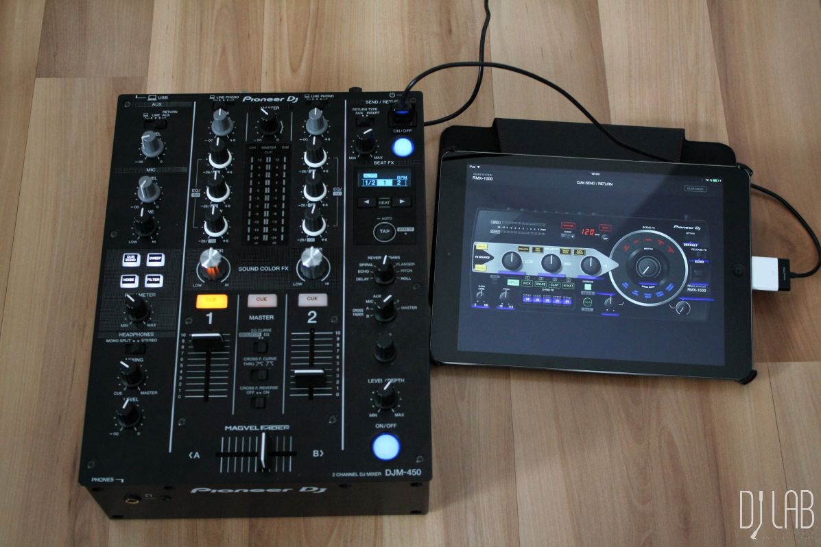 Mit den Color-Effekten Dubecho, Sweep, Noise und Filter sowie mit den Beat-Effekten Delay, Echo, Spiral, Reverb, Trans, Flanger, Pitch und Roll könnt ihr kreativ arbeiten und Songs in die Mangel nehmen. Gut gefallen hat mir die Option App-Effekte per Tablet einschleifen zu können. Klar ist die gewählte Schaltung nicht ganz so flexibel wie eine „echte“ Send-Return-Schleife mit analogen Ein- und Ausgängen, aber ziemlich cool gelöst, wenn man ein iPad hat. Ihr müsst dieses lediglich an den USB-Anschluss auf der Oberseite des Mixers anschließen und die App starten. Sehr gut funktioniert die Pioneer-DJ-eigene App RMX-1000 aber auch zahlreiche andere, die beispielweise Audiobus kompatibel sind. Auf diese Weise steht euch ein riesiges Effektarsenal zur Auswahl. Alternativ könnt ihr den digitalen Auxweg auch dazu nutzen, das iPad als Zuspieler einzubinden. Da der Mixer nicht unbedingt für Scratch-Profis gedacht ist, fällt das mit circa 2 Millimetern etwas groß geratene Cut-Lag des Crossfaders nicht weiter ins Gewicht. Etwas bedauerlicher finde ich dagegen den Verzicht auf den separaten Monitorausgang, da dieser nur mit etwas Aufwand kompensierbar ist.