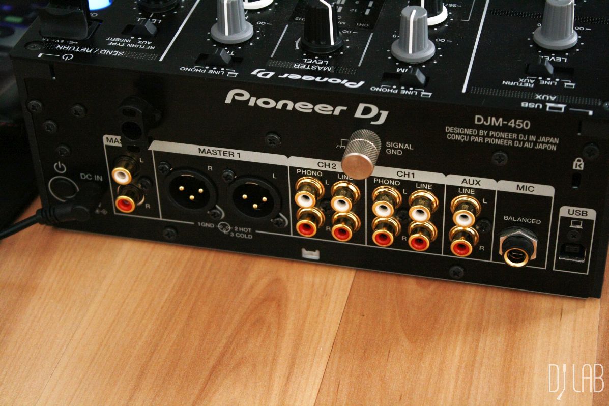 Die Kontrolle des Mastersignals erfolgt per Drehregler, eine separate Booth-Regelung gibt es hingegen nicht. Auf der Rückseite des DJM-450 gibt es zwei Phono- und zwei Line-Eingänge die den Kanalzügen zugeordnet sind sowie einen Line-Aux-Eingang und einen Mikrofonanschluss.