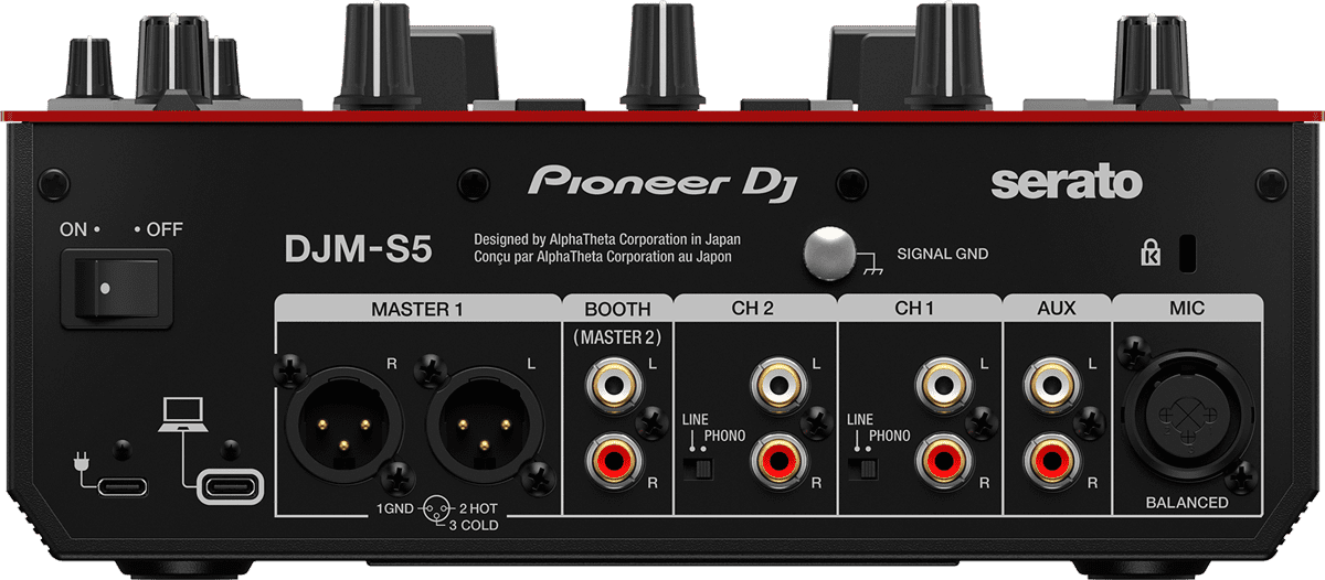 Als Besonderheit gibt es keinen „richtigen“ Netzteilanschluss, sondern zwei USB-C-Buchsen. Eine der beiden Buchsen kann ausschließlich zur Stromversorgung genutzt werden, die andere dient zur Kommunikation mit einem Computer bei gleichzeitiger Stromversorgung. Somit kann man den Mixer auch ohne direkten Steckdosenkontakt betreiben. Kommt der DJM-S5 in einem Setup ohne Computer zum Einsatz, übernimmt ein Smartphone-Netzteil (oder eine Powerbank) die Stromversorgung, hier sollten aber nur Geräte genutzt werden, die 5V/500 mA oder mehr leisten und dabei nicht mehr als 100 W liefern.