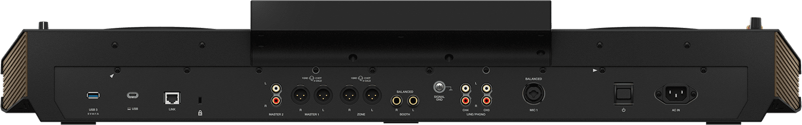 Pioneer DJ hat den Opus mit einer Vielzahl an analogen und digitalen Anschlüssen versehen. Auf der Rückseite des Geräts befinden sich kombinierte Phono-/Line-Eingänge für die Kanäle 3 und 4, die Setup-Erweiterungen durch Zuspieler erlauben. Des Weiteren gibt es insgesamt zwei Mikrofoneingänge, die auf der Vorder- und Rückseite ausgeführt sind. Die Ausgangssignale lassen sich über Master- und Zone-XLR-Buchsen ausgeben, um verschiedene Räume beschallen zu können. Der Opus bietet zudem einen weiteren Masterausgang mit Cinch-Buchsen und einen Booth-Ausgang zur Speisung von Monitorboxen.